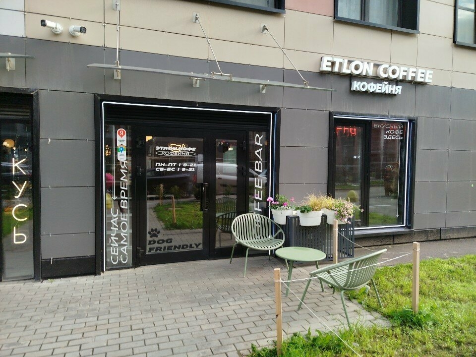 Кофейня Etlon Coffee — это уютное место с дизайнерским интерьером и проектором на потолке, где можно посмотреть фильмы или мультфильмы. В кофейне есть кресла-коконы с небольшими столиками, а также обычные столики и стулья.