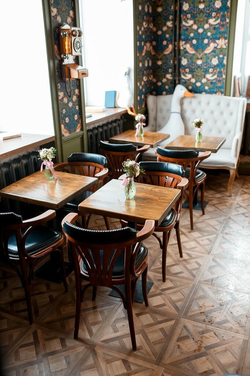 Кофейня Gussi — это уютное место, где можно насладиться ароматным кофе, чаем и десертами. Интерьер кофейни выполнен в винтажном стиле, с винтажной мебелью, обоями и предметами декора, такими как проигрыватели виниловых пластинок и дисковый телефон.