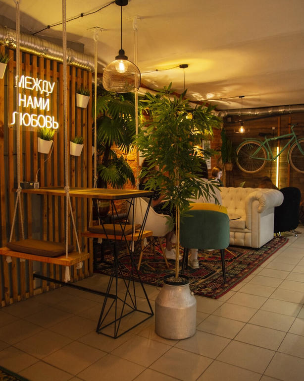 Кофейня «Лица» — это уютное место с ярким интерьером, наполненным искусственными растениями, кожаными креслами в этно-стиле и веревочными качелями, разделенными столиком. На стенах — картины и светящиеся диодные надписи.